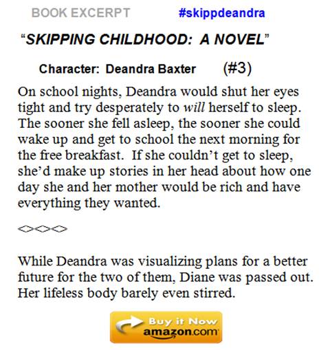 Below are screenshots of the book excerpts that are currently available in the tweets and on the website. Why not take a few moments and get to know Deandra Baxter and a few other characters?